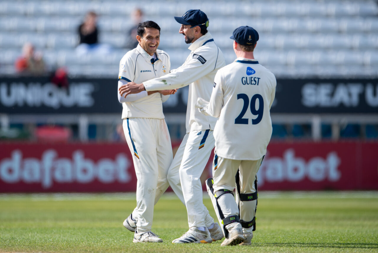 Before tea on the second day, however, following a multitude of twists and turns and a fine 96 not out from Chesney Hughes, Derbyshire won the game by 54 runs. Graham Wagg with six wickets, and Tim Groenewald and Steffan Jones with five apiece took the bowling honours.